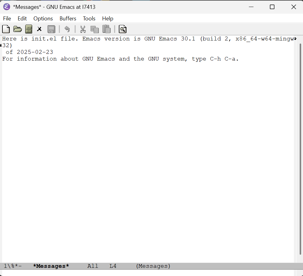 Let’s now display the content of the Messages buffer, for example through the Buffers menu or through the keyboard shortcut Ctrl-x Ctrl-b. The buffer content should show the text